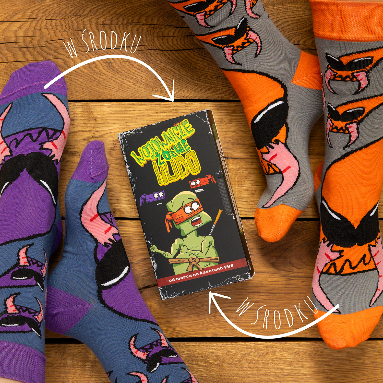 Przed Wami kolejna nowość – drugi zestaw VHS ze skarpetkami! Projekt, nad którym spędziliśmy naprawdę dużo czasu. Must have fana Kapitana Bomby, Święty Graal miłośnika twórczości Walaszka – nazywaj to jak chcesz. My wiemy, że jest to po prostu kozackie i każdy szanujący się koneser uniwersum KB musi to mieć w swojej kolekcji! Zgadza się, dobrze widzicie. Przygotowaliśmy dla Was zestaw dwóch par skarpetek zapakowanych w kolekcjonerskie, specjalnie zaprojektowane pudełko imitujące kasetę VHS jednego z największych hitów w całej historii kinematografii – „Wojownicze Żółwie Hudo”.
